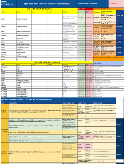 Additionally we created sheets to track props, costumes, equipment and individual dietary preferences. All this information would go seamlessly into a call sheet that mapped out each day (total of 15) in the production down to the T. Organization is key, specially if you're also directing the film.