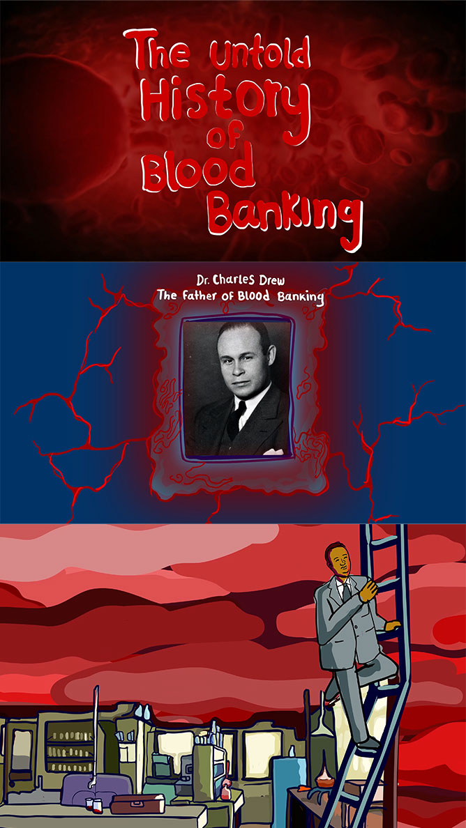 Dr. Charles Drew, "The Father of Blood Banking", his design was based on some very old family portraits. In my sketchbook I conceptualized and early 20th century laboratory and hospital. I was moved to making the animation for this song resonate like a mural painting, like you'd see in predominately black communities honoring outstanding historical figures in the community.