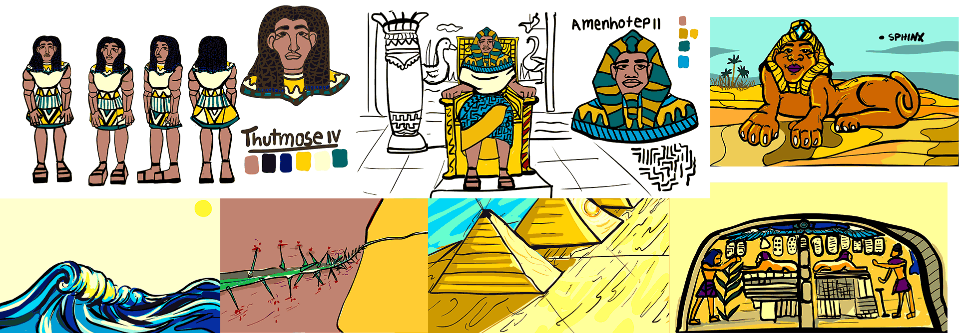 The Prince and The Sphinx incorporates grammar lessons of metaphor and similes. For this project I decided to incorporate surrealism into the animation. The song was performed in first person, so it was important for me to animate Thutmose the IV rapping the lyrics.