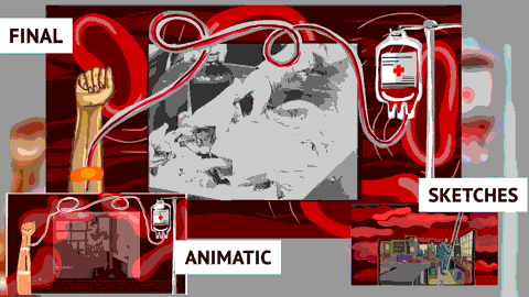 For the Untold History of Blood Banking, the animation was collaged with footage of the historical events being talked about in the song. the animatic sketches for the designed were meant to showcase my intentions with depicting the blood cells on the animation and the color applications.