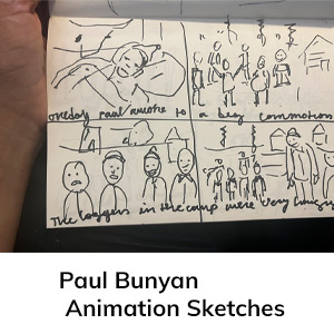 Flocabulary animation projects have deliverable checkpoints every few weeks to check on the progress on the animation and catch any changes in the design. This is an animatic frame for the Paul Bunyan Video, it shows the basic compositions and actions of the shot.