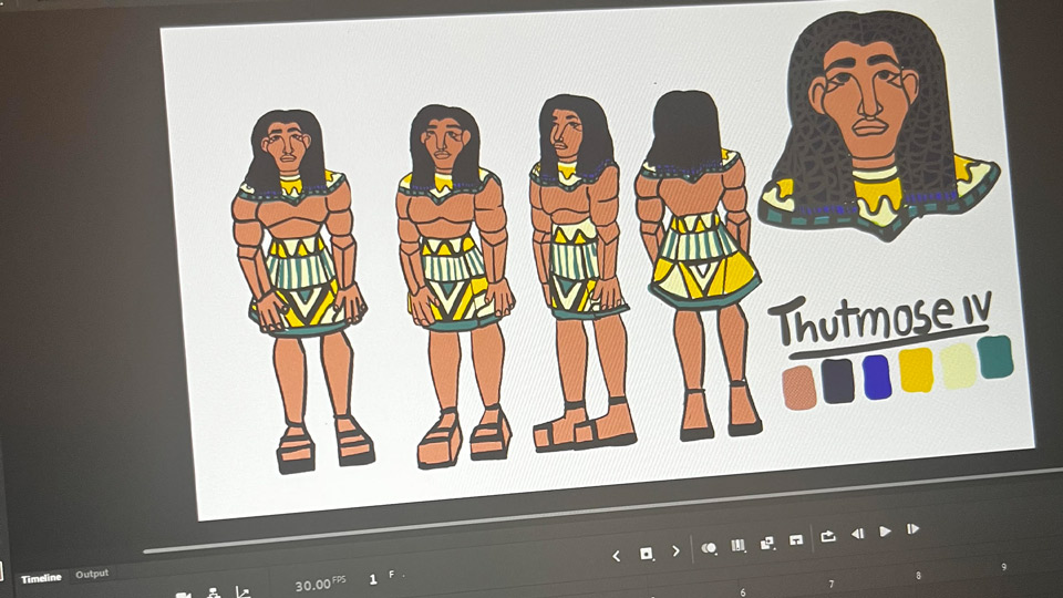Original Thutmose IV sketches without a shirt on. After review of the content, Natasha the art director for this project, got back to me about giving him a shirt to wear. since these videos are made for school age children we don't wan to create any issues with mature content looks.
