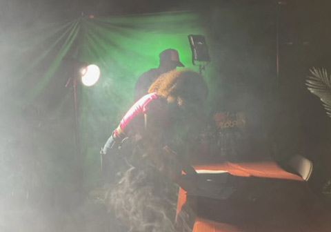 Dilenia and the FBoys crew making sense of a foggy scene during film production.