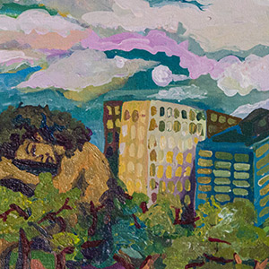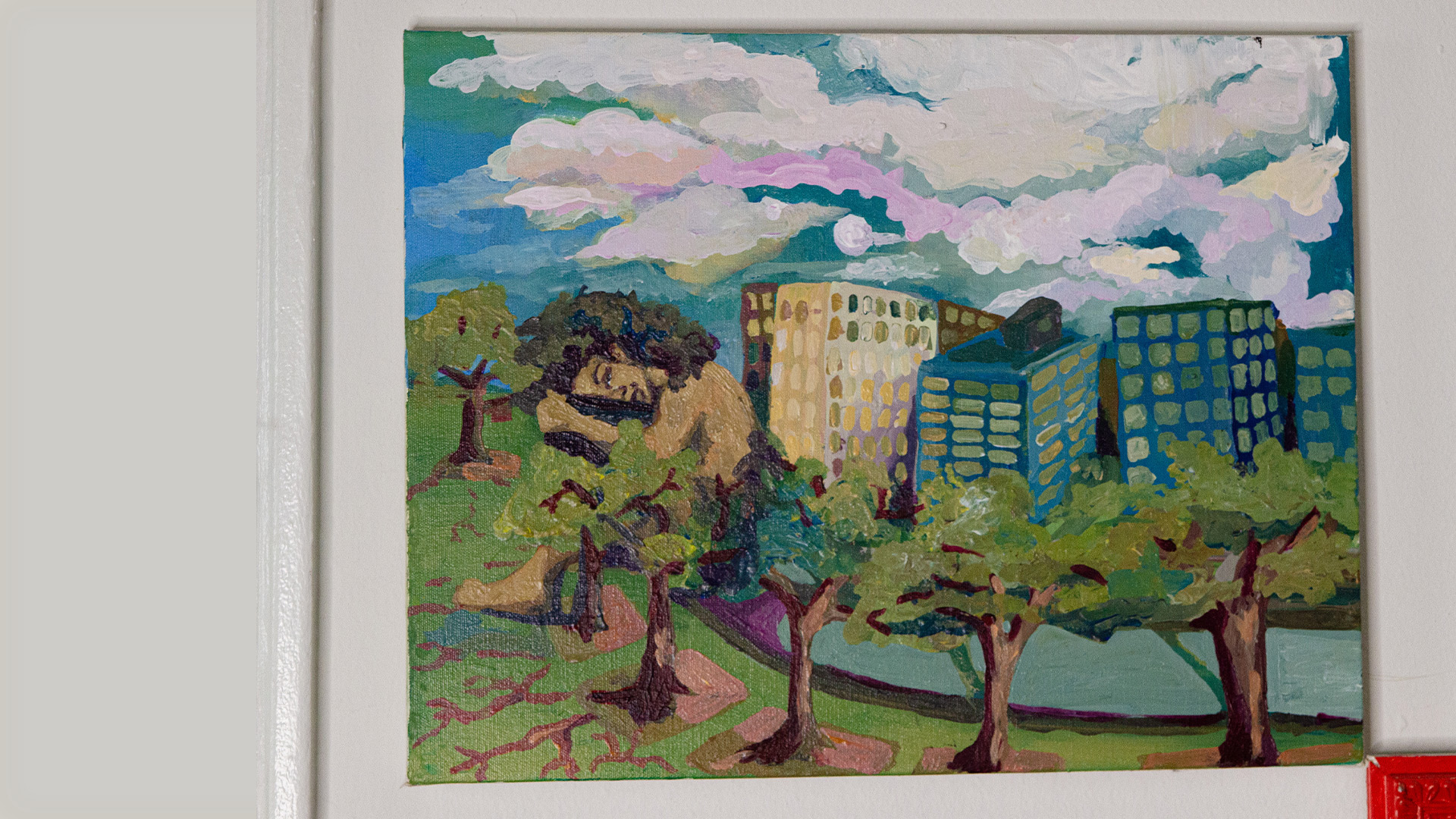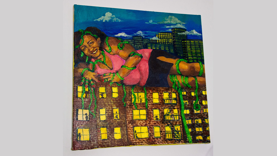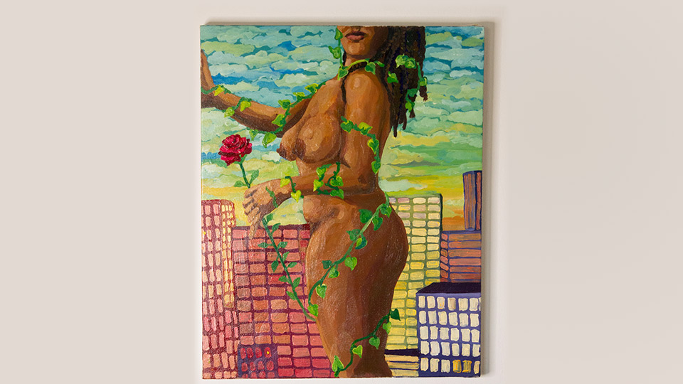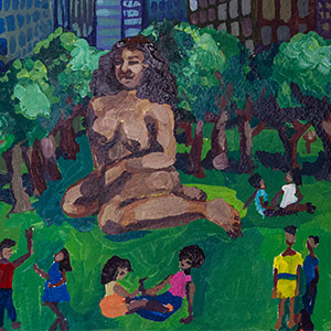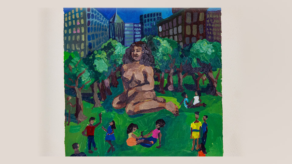 This small painting on watercolor paper is the first thing I made for this series. I drew inspiration from Prospect Park on a spring weekend. I think the nudity speaks towards the vulnerability of showing up in the world. From this small painting I grew the idea of painting large black women in city scapes.