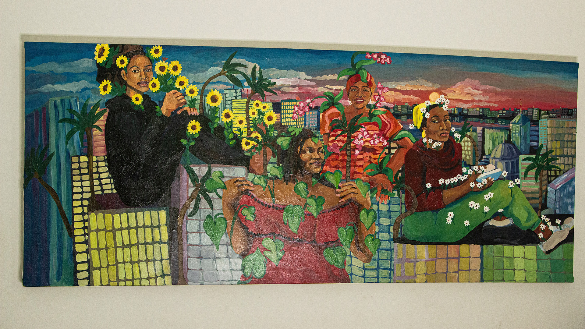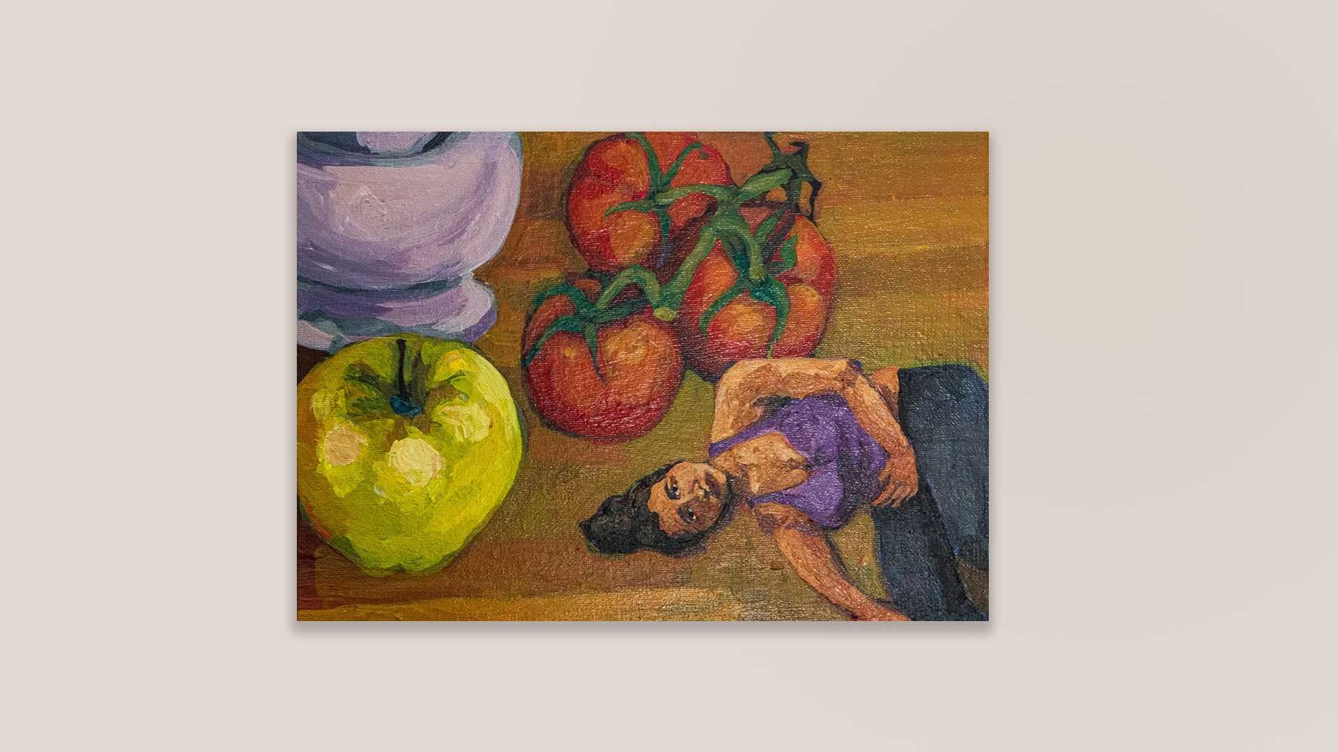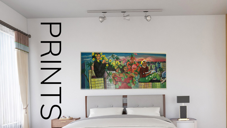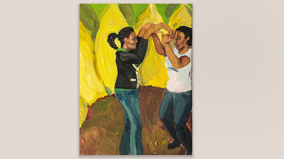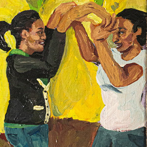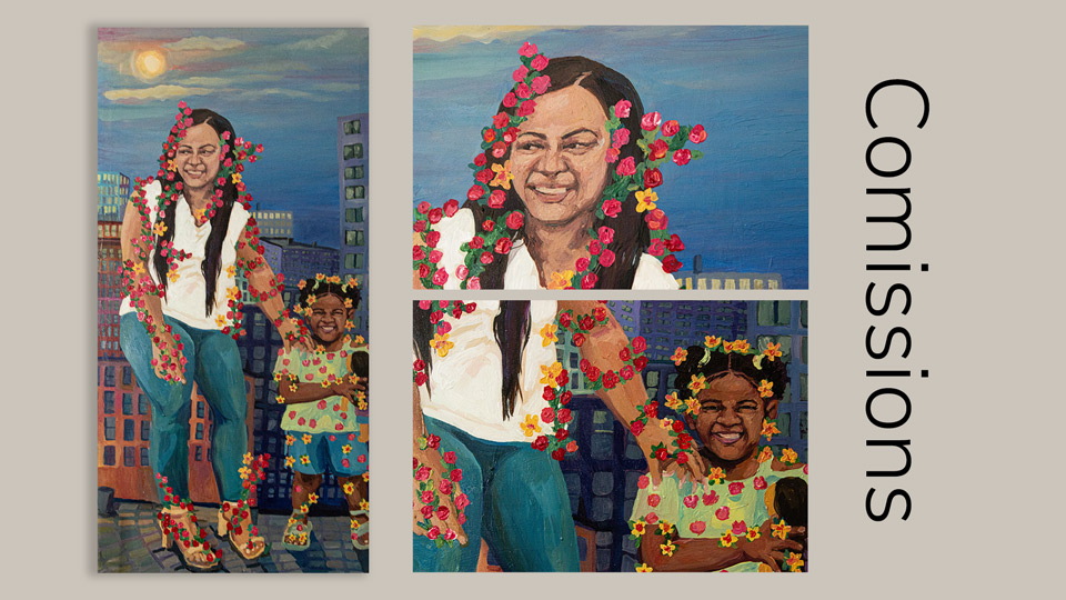 As the final painting in this series, two aunties dancing bachata on a sunflower. Invoking fun experiences and meaningful bonds.