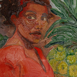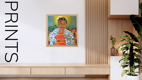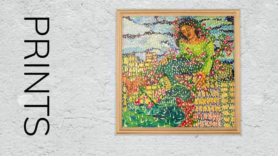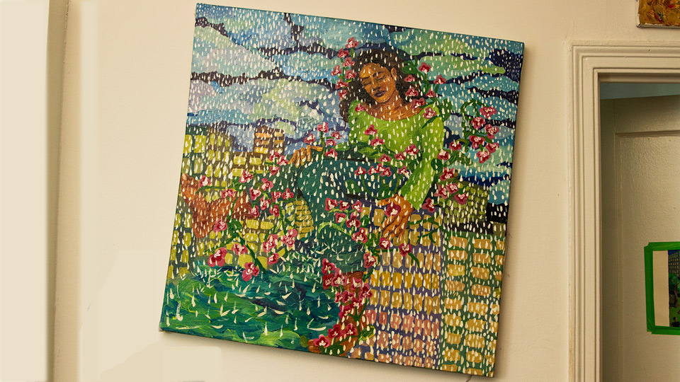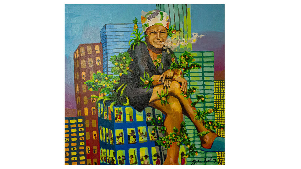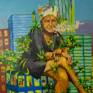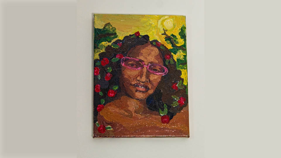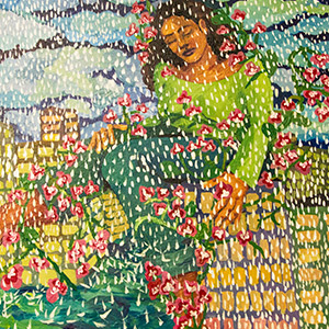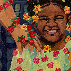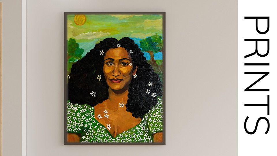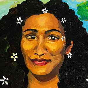 Portrait of the artist smiling. She's wearing green with a white flower patter that grows into her dark curly hair. The mix of brown and and beige shades with a yellow undertone for her skin. The backgroud is a yard with a tree, green undertones, and bright sunshine.
