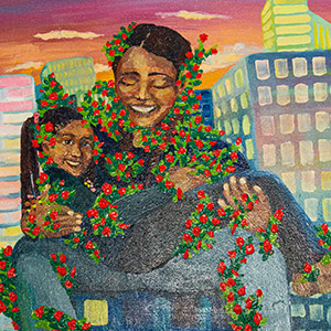 In spiritual terms I looked at Madonna and child, as both an art motif and religious one. I wanted to maintain the integrity of joy in the painting while just-a-poxing an image like madonna and child, where in most depictions tend to be mildly sad.