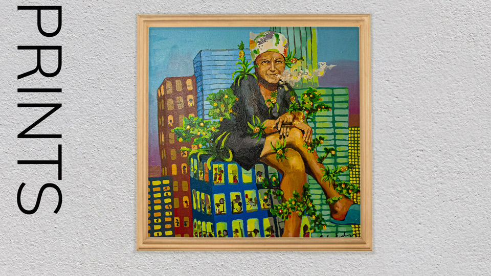 The inspiration for the vibrant colors must've come from my daily walking commute to the gym. That Crown heights Hill looked turquoise. The rising new out of place buildings grabbed my attention, they were almost too reflective. When I added pineapple plants to her portrait I didn't know that Consuelo's yard in the DR had them growing abundantly. The area where she lived was covered cocoa bean plants among all kinds of wild tropical fauna.
