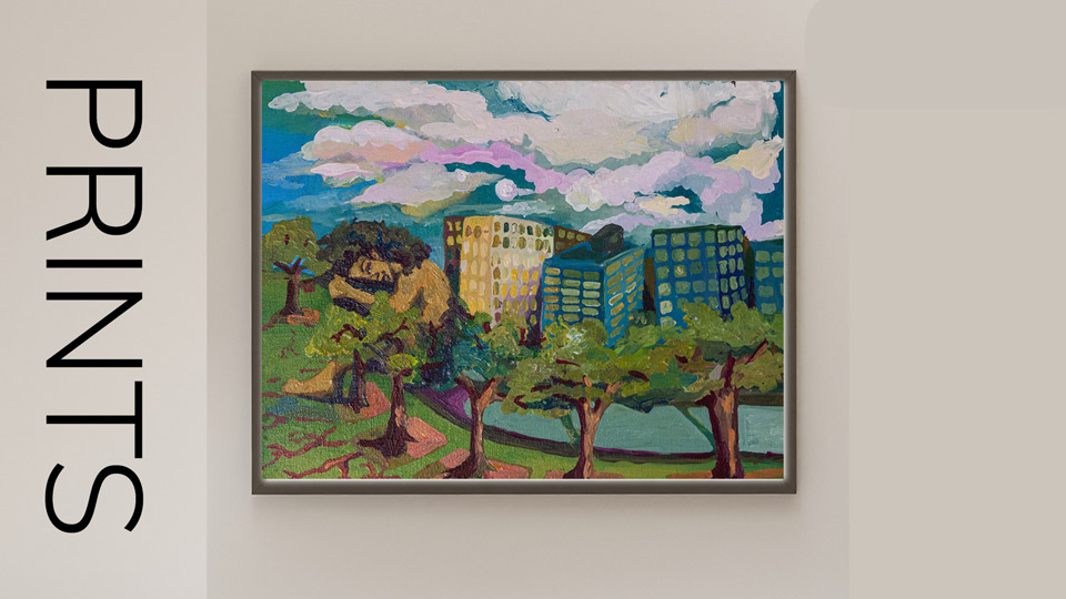 There was so much rain in Brooklyn in 2021, the flood that displaced me was the third one that year. I was able to save the last canvas I had stretched. I decided to paint about the present moment, and overwhelm the canvas with white painted rain. A flooded city and the first sad person in this entire city.